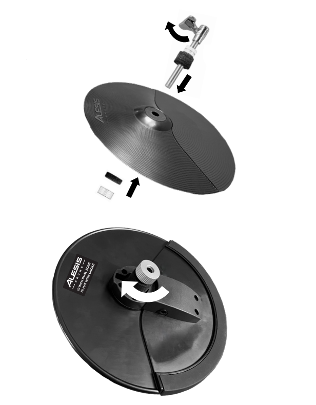 シンバルの上下にフェルトがあることを確認し、クラッチの両端のナットを締めて固定します。多少の動きは許容されますが、シンバルパッドが回転しないよう、ある程度しっかりと締めておくことをおすすめします。